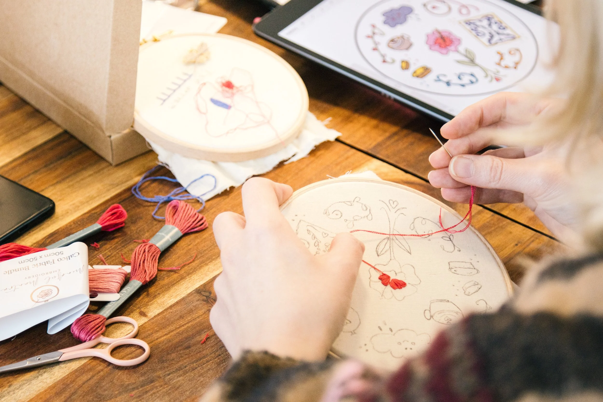 Sophie’s workshops are designed in a stitch-along format, so everyone will work on the same pattern. Learn about using watercolor with embroidery, then focus on foundational stitches and useful embroidery techniques.Do I need to bring my own embroidery materials?